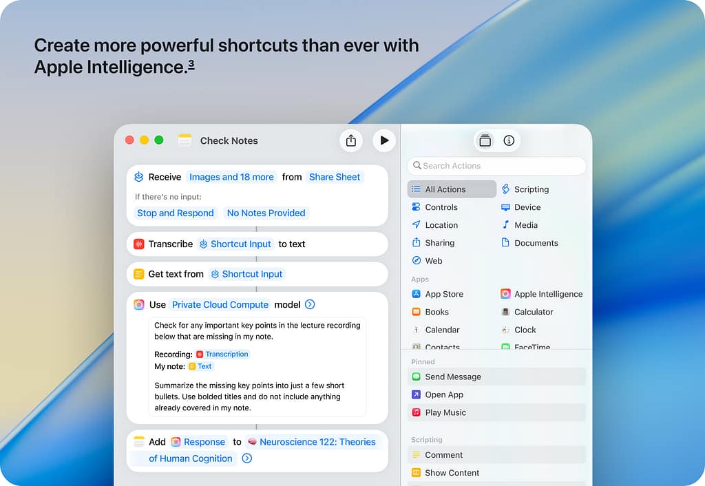 Apple’s new Smart Actions enhance the Shortcuts app, providing users with the ability to create more complex automations, such as text summarization and image generation. Users can integrate both Apple Intelligence and ChatGPT models to generate responses within Shortcuts, which can be triggered automatically based on specific times or events.