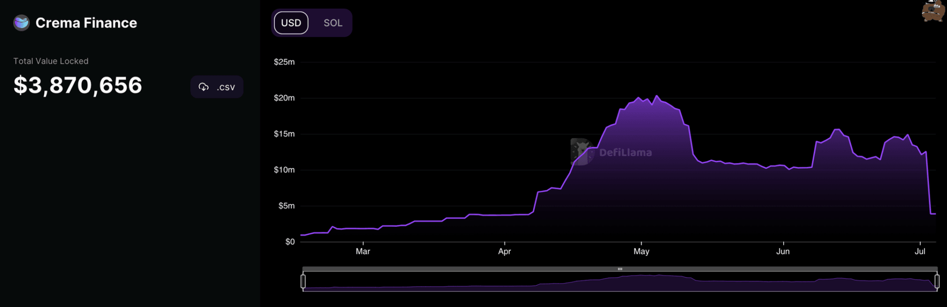 After the attack, Crema Finance’s TVL (Total Value Locked – the total value of locked assets of a DeFi ) was quickly reduced. Specifically, Crema Finance’s current TVL is at less than $3.9 million, only about 31% of TVL before the hack was announced.