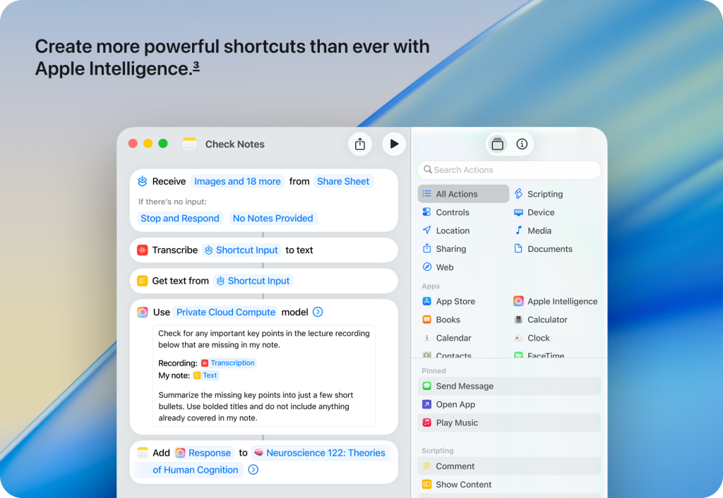 Apple’s new Smart Actions enhance the Shortcuts app, providing users with the ability to create more complex automations, such as text summarization and image generation. Users can integrate both Apple Intelligence and ChatGPT models to generate responses within Shortcuts, which can be triggered automatically based on specific times or events.