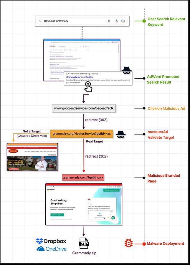 If Google detects that the malicious landing page is advertised, it will definitely be blocked and the ad removed immediately. So the threat actors need to use a little trick to get past Google’s automated checks.
