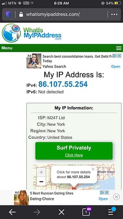 Good news, the change of IP address for our iPhone worked well. You can see that we are now located in the United States, in New York State, as indicated by NordVPN. We also note that the IP address of our iPhone has been hidden since it is now 86.107.55.254 which is visible.