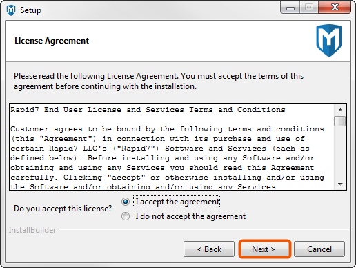 - Read the license agreement. To proceed, you must accept the license agreement. Select the I accept the license agreement option and click Next to continue.