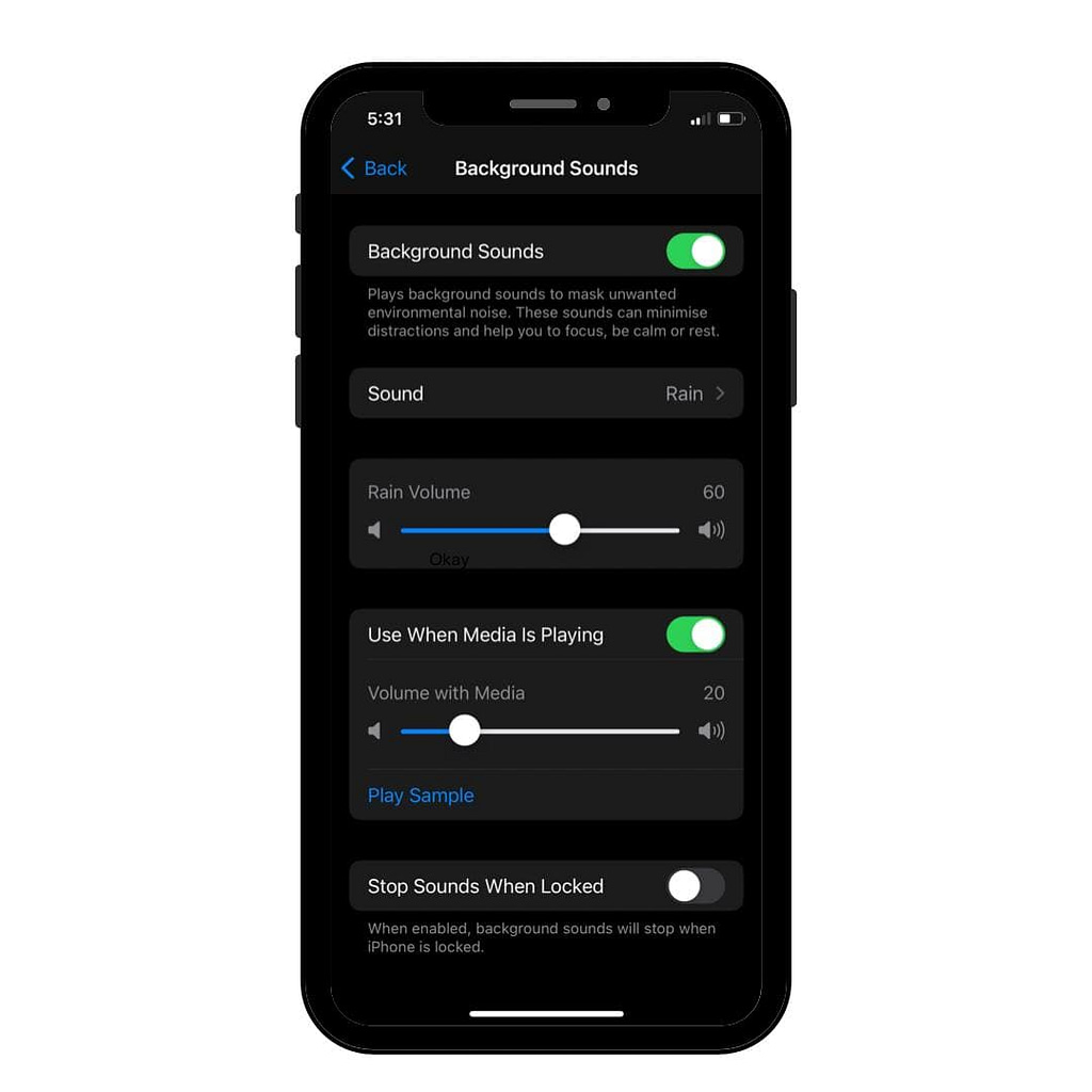 As Apple points out, the iPhone “plays sounds in the background to mask unwanted surrounding noise. These sounds can minimize distractions and help you focus better, calm down and rest. Conveniently, these sounds can be played along with the music.