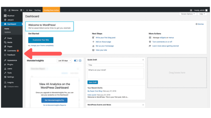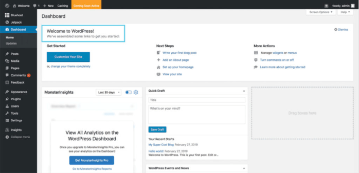 The entire building for your website starts in the WordPress admin dashboard. You control every aspect of your website through your designs, plugins and menus. As you continue to build your website, you should familiarize yourself with all of the dashboard features that you will use frequently.