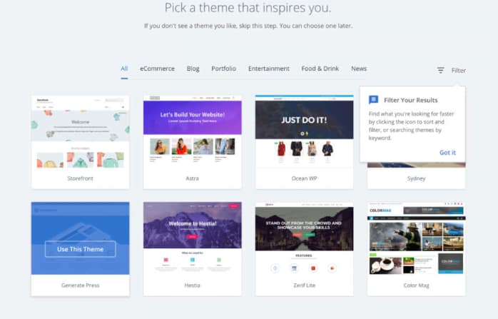 If you choose Bluehost for your web host, WordPress will be installed for you automatically and offers hundreds of designs to help you get your site out. After clicking “Enter” you will be asked to choose a topic. If you are not sure of the design you want, you can always go back and select it later. The WordPress Themed Library contains standard themes, free themes, and premium themes that allow you to add a dynamic layout to your site for an easy web building experience.