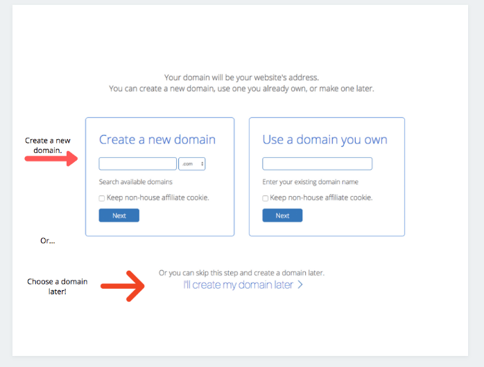 After choosing your domain name, click “Next”. The system is displayed when the desired option is available. You can choose from a number of combinations to get the right domain for your website. For example, you might want to use .blog or .us instead of .com. If you are not ready to choose a domain name, you can create it later at any time!