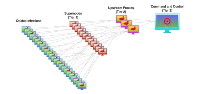 QakBot, like Emotet and IcedID, uses a 3-tier server system to control and communicate with malware installed on infected computers. The primary purpose of tier 1 and 2 servers is to forward communications containing encrypted data between infected machines and level 3 servers that control the botnet.